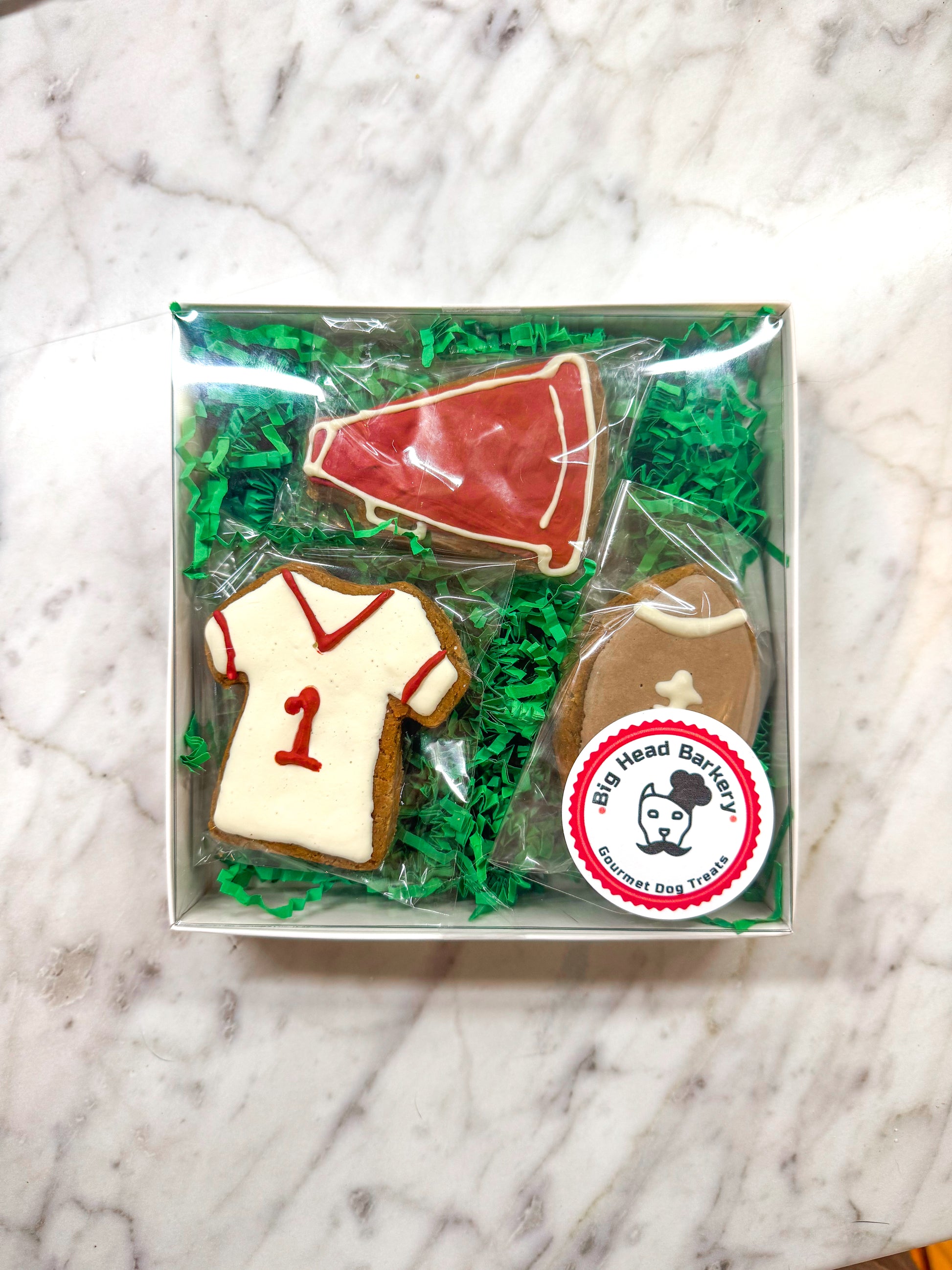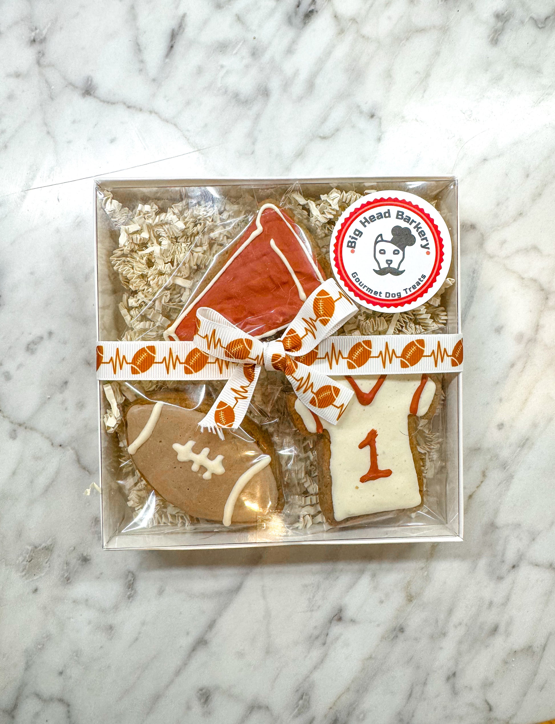 Get your pup game-day ready with our Football Treat Set! This hand-decorated cookie trio is made from our signature peanut butter recipe and iced with dog-safe, yogurt-based icing. Perfect for tailgate parties, football Sundays, or just celebrating your #1 fan.