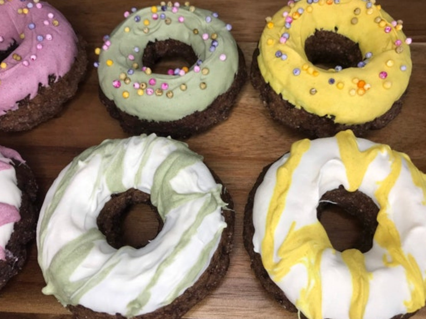 Each donut is handmade in small batches with all-natural, human-grade ingredients. We keep it clean — no artificial dyes, just natural color from beet root, spinach, and turmeric powders mixed into melted unsweetened yogurt chips.